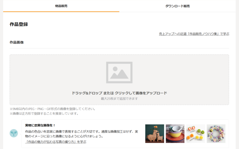 作品登録ページを開くと、最初に求められるのが作品写真のアップロードです。