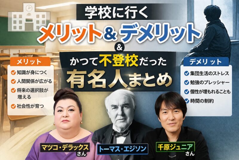 この記事では学校に行くメリットとデメリット、そして学生時代不登校であっても、その後成功を収めた有名人たちの紹介をしました。