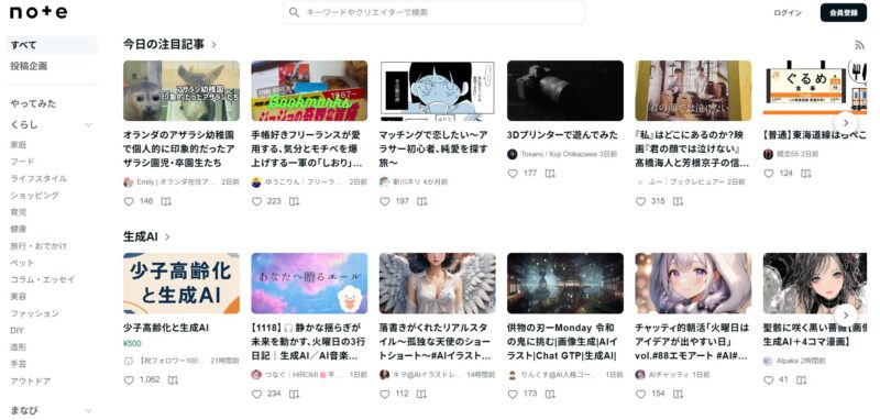 note は、文章・画像・音声・動画など、さまざまな表現を気軽に投稿できるプラットフォームです。SNSのように手軽でありながら、ブログのようにじっくりと発信できる点が特徴です。